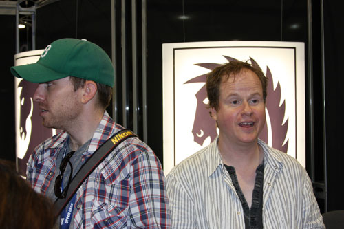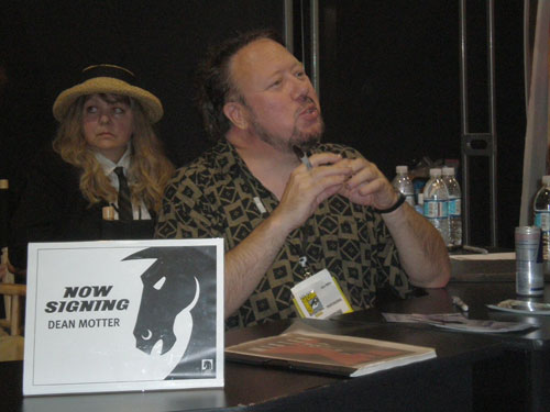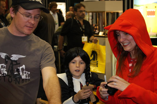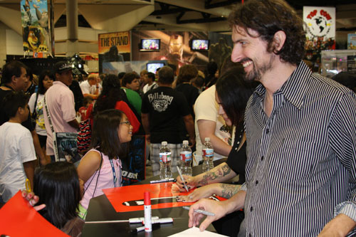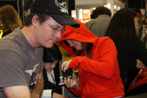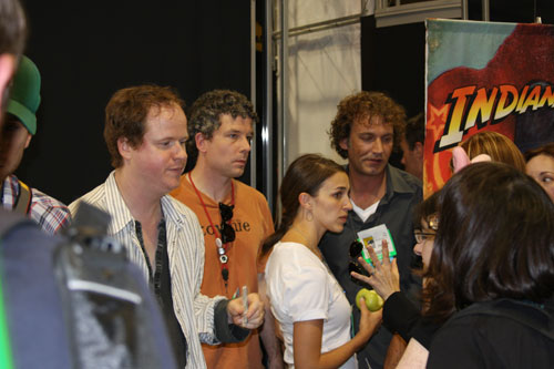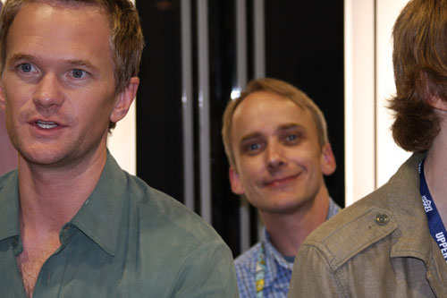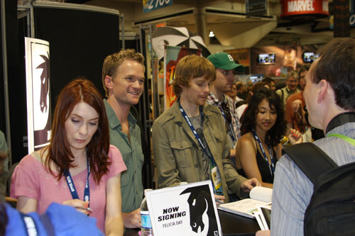 Let the Dr. Horrible signing begin (L to R): Felicia Day, Neil Patrick Harris, Jed Whedon,