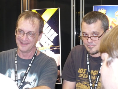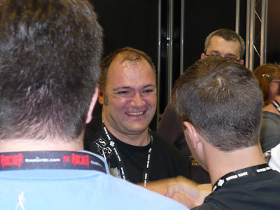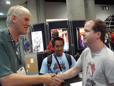 Mike Richardson and Joss Whedon greet each other.
