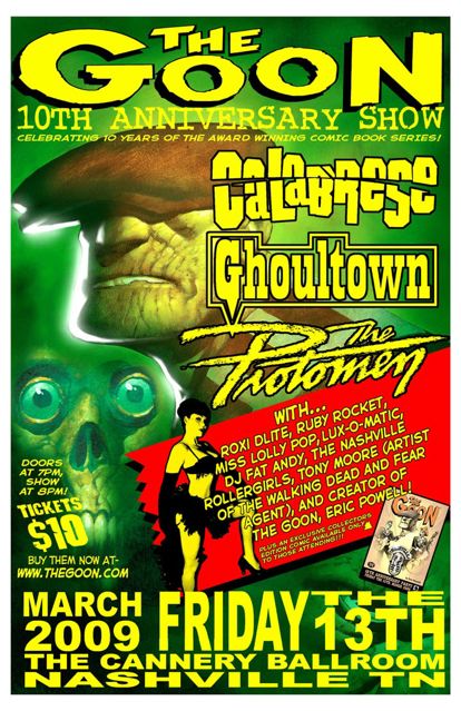 On March, Friday the 13th, an event commemorating the 10th anniversary of Eric Powell's acclaimed comic book series, The Goon, will be held at the Cannery Ballroom in Nashville, Tennessee. The Goon is the winner of The 2004 International Horror Guild award for Best Illustrated Narrative and is a recipient of five Will Eisner Comic Industry Awards. With an established diehard cult following as a comic, the Goon now prepares to move into the world of film after being optioned by Academy Award nominated director and producer David Fincher (Benjamin Button, Fight Club, Zodiac) and Academy Award nominated Blur Studio to develop as a CG animated feature film with Dark Horse Entertainment.The Goon anniversary show will feature performances by The Protomen, Ghoultown, Calabrese, as well as Roxi Dlite, Ruby Rocket, Miss Lolly Pop, Lux-O-Matic, Monique Honeybush, and Sadie Twist. Also in attendance will be The Nashville Rollergirls, Tony Moore (co-creator of The Walking Dead and artist of Fear Agent), and Eric Powell will be there for signings and to make a special announcement about his next Goon project slated for this summer--a project surely to be the most bizarre and unexpected yet in the Goon mythology. Party goers will also be able to pick up exclusive merchandise found nowhere else! Including a limited edition 10th Anniversary Goon comic book and a print from the legendary Nashville based Hatchshow Print Company. The doors of this 18+ show at the Cannery Ballroom open at 7pm and the show begins at 8pm. Tickets are only $10.