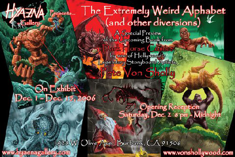 PETE VON SHOLLY is an artist/writer/producer/director with an emphasis on the fantastic side of the arts. One of Hollywood's legendary storyboard artists, Pete has worked on over one hundred feature films including DARKMAN, JAMES & THE GIANT PEACH, MARS ATTACKS!, NIGHTMARE ON ELM ST. (parts 3 and 4), and THE SHAWSHANK REDEMPTION. This special preview of Pete's new book is guaranteed to be a treat for all horror, science fiction, and monster art fans . . . Come see his art and meet this highly celebrated and prolific artist!