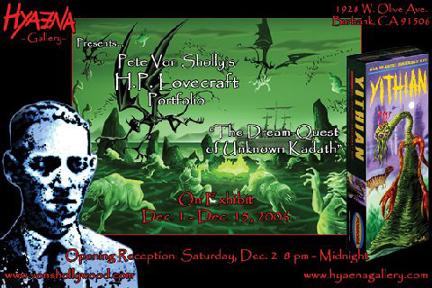 The Dream Quest of Unknown Kadath has been called "Lovecraft's Lord of the Rings", an epic hallucinogenic odyssey through his unique "dreamworld"- a place of exotic lands peopled with monsters, gods, and monstrous gods! It is a saga of epic proportions featuring HPL's eternal dream-master, Randolph Carter and his quest for the Sunset City of his childhood. Pete Von Sholly presents a 20 piece portfolio showcasing some of the visual highlights of this little-known fantasy masterpiece, available to the public for the first time at Hyaena!
