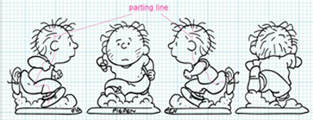 The Yoe! team then created a color palette, submitting the colors as designated by the widely used "PMS" color codes. Again, this was consistent with the Peanuts style guide. The coloring was essential to the success of Pig Pen. Experimentation revealed that the black speckled dots Schulz used to convey dirt and grit came off as if they were acne or skin blemishes. Ms. Gussoni came up with a smudgy paint effect that looked, well, "dirty." While this solution was actually quite different than the cartoon sketches, it was an inspired choice that really solved the problem. We had arrived at a Pig Pen that was true to the underlying character, but attainable in production.