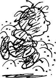 The Yoe! team then created a color palette, submitting the colors as designated by the widely used "PMS" color codes. Again, this was consistent with the Peanuts style guide. The coloring was essential to the success of Pig Pen. Experimentation revealed that the black speckled dots Schulz used to convey dirt and grit came off as if they were acne or skin blemishes. Ms. Gussoni came up with a smudgy paint effect that looked, well, "dirty." While this solution was actually quite different than the cartoon sketches, it was an inspired choice that really solved the problem. We had arrived at a Pig Pen that was true to the underlying character, but attainable in production.