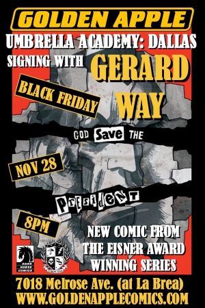 Gerard Way will be at Golden Apple Comics on Friday, November 28th at 8:00pm, to promote the release of the 1st issue of the Umbrella Academy: Dallas series.