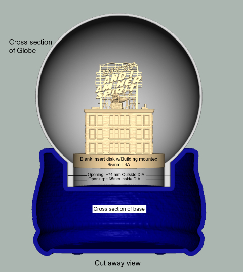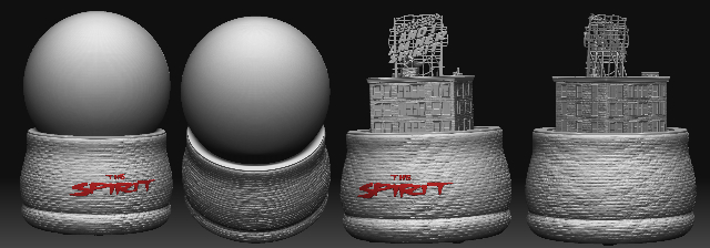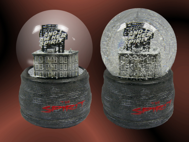 The The Spirit Snow Globe was particularly challenging due to its size. We don't think about it, but a water-filled globe has a magnifying effect on the object inside. It creates an optical illusion, increasing the apparent scale of whatever is inside by about 20%. That might not sound like very much, but when you are talking about a city building with small details like a fire escape, not to mention the very tiny lettering on the sign mounted on the building, it was akin to engraving the Lord's Prayer on the head of a pin.
