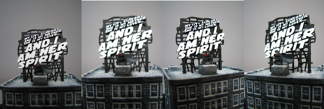 The output on the snow globe was handed to one of the toy industry's top mold makers for casting. Well known and respected in the trade for his excellent work for clients like DC Direct, Mezco, Toy Biz, and Diamond, "Irish Joe" Ferrell, based in Georgia, grabbed the work between his teeth and had at it with his usual vigor. He found himself creating special two-piece molds, rejecting the first version of the sign lettering, and essentially handcrafting the fire-escape details in a clear plastic. The project was now ambitious not only for what it was, but also for the geographic distance between the various participants.