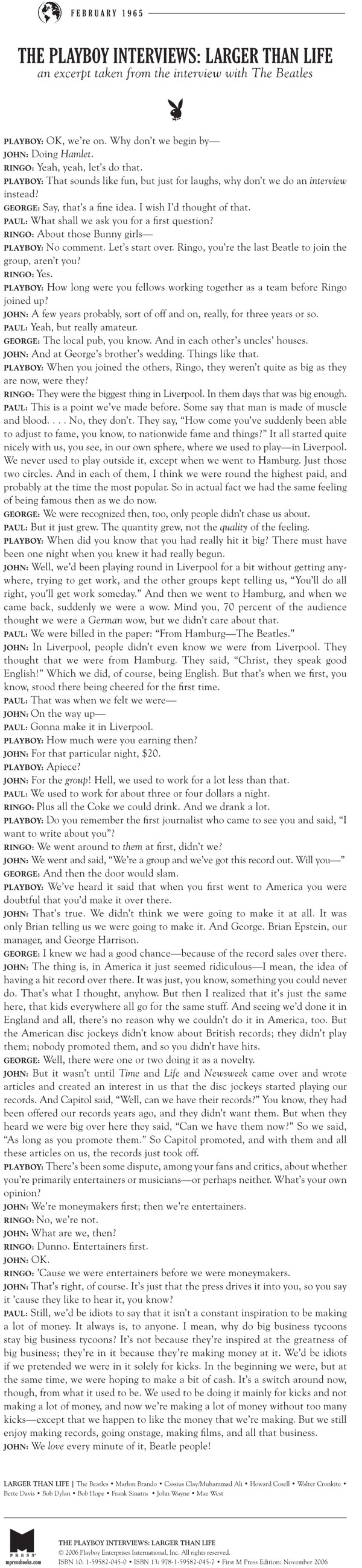 Fame: It's a world unto itself. Only certain people--the lucky few--are permitted entrance. Their notoriety and influence shape our views on politics, art, commerce, music, even the way we dress and speak. Our lives become defined by how we were before they existed and how we see ourselves after. Everyone remembers where they were the first time they heard the Beatles, watched Muhammad Ali step into the ring, or how they sat in amazement as Marlon Brando filled the big screen. For the last 40 years, Playboy magazine has gone into the living rooms and into the minds of America's glittering few, capturing in candid interviews the thoughts and emotions of these historic men and women at the height of their fame. Now, Playboy and M Press are honored to collect the interviews of 14 people who shaped the world, who can truly be called Larger Than Life.