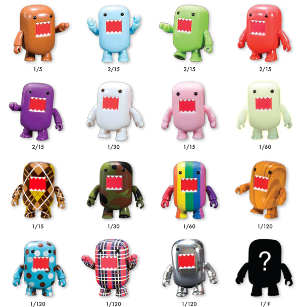 In this mystery-box assortment, figures are sold in counter displays of fifteen. As a bonus we have added a “Build-a-Domo” feature. Each individual box will contain one Domo part (arm, leg, body, etc).