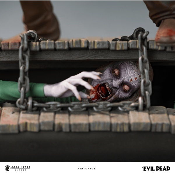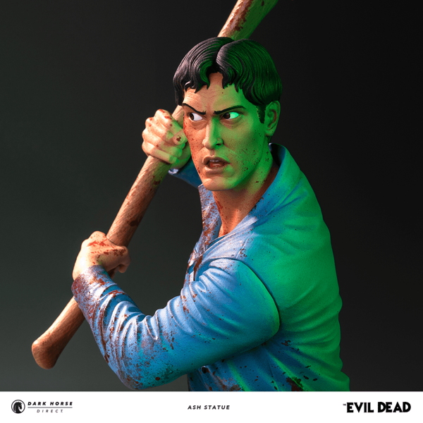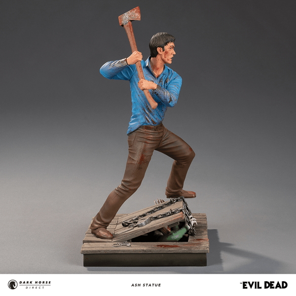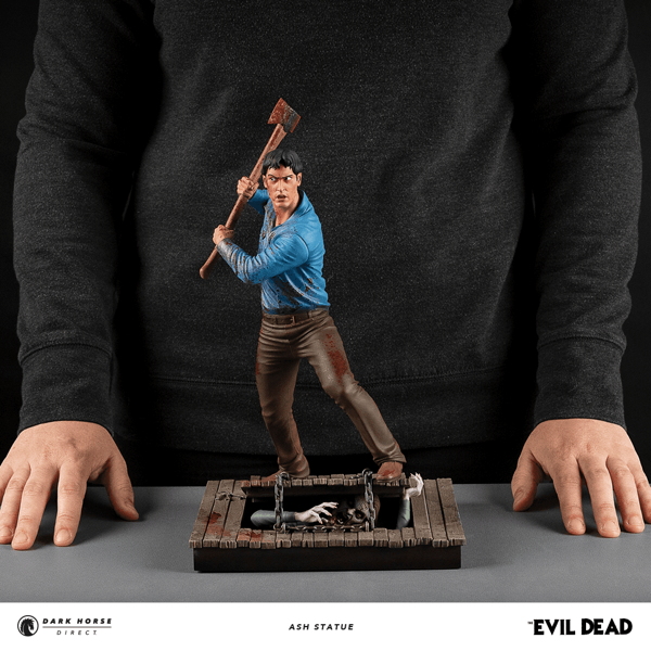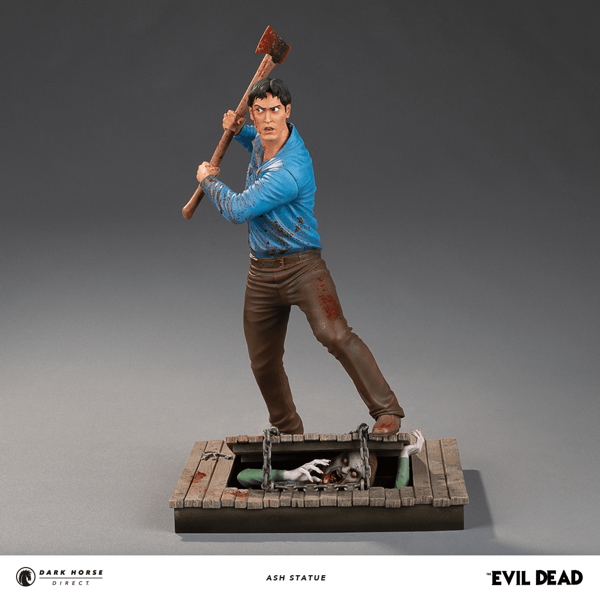 Dark Horse Direct and Renaissance Pictures have teamed up and are proud to introduce one of horror's most iconic characters, Ash, from The Evil Dead! Poised atop the cellar door keeping his beloved sister, Cheryl, at bay, Ash wields a trusty axe ready to fend off any oncoming deadites.