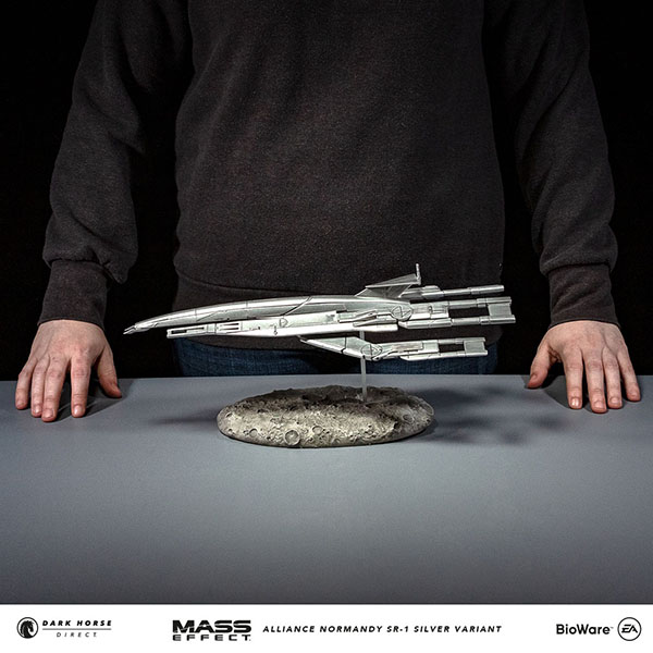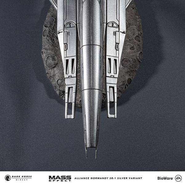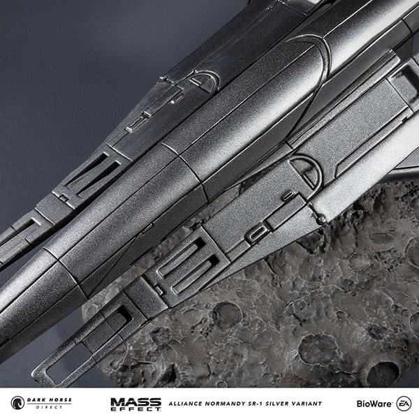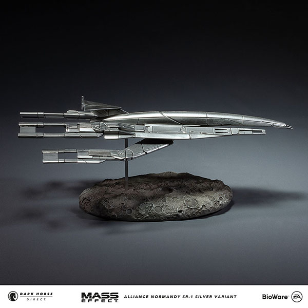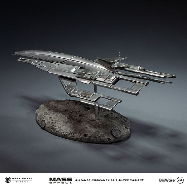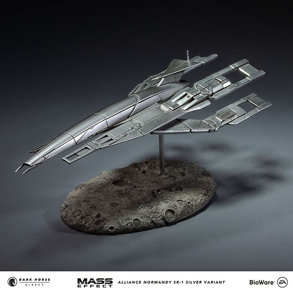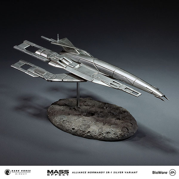 Dark Horse Direct and BioWare present the release of an exclusive silver variant of Mass Effect's legendary Normandy SR-1! Keep your model rack as stocked as Shepard's with this 14'' long, 5.6'' wide all silver prototype starship, perched upon a crater pocked moon terrain base.