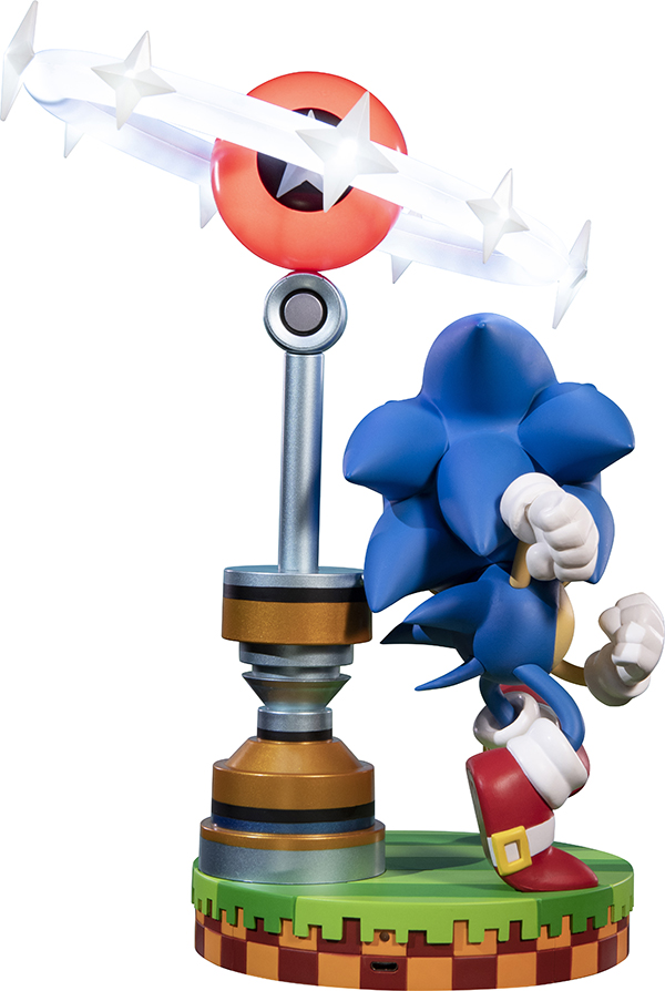 The highly detailed Sonic PVC statue is seen striking a dynamic pose, revving up to run faster than the speed of sound. The base design is inspired by the Green Hill Zone, and on it is also the Star Post checkpoint, which you can rotate up to 90 degrees, allowing for multiple viewing angles. If you have 50 rings when reaching a checkpoint, a Star Circle will appear, which grants you access to a special level. The Collector's Edition of this statue comes with the Star Circle and bright LED functions for both the checkpoint bulb and the Star Circle.