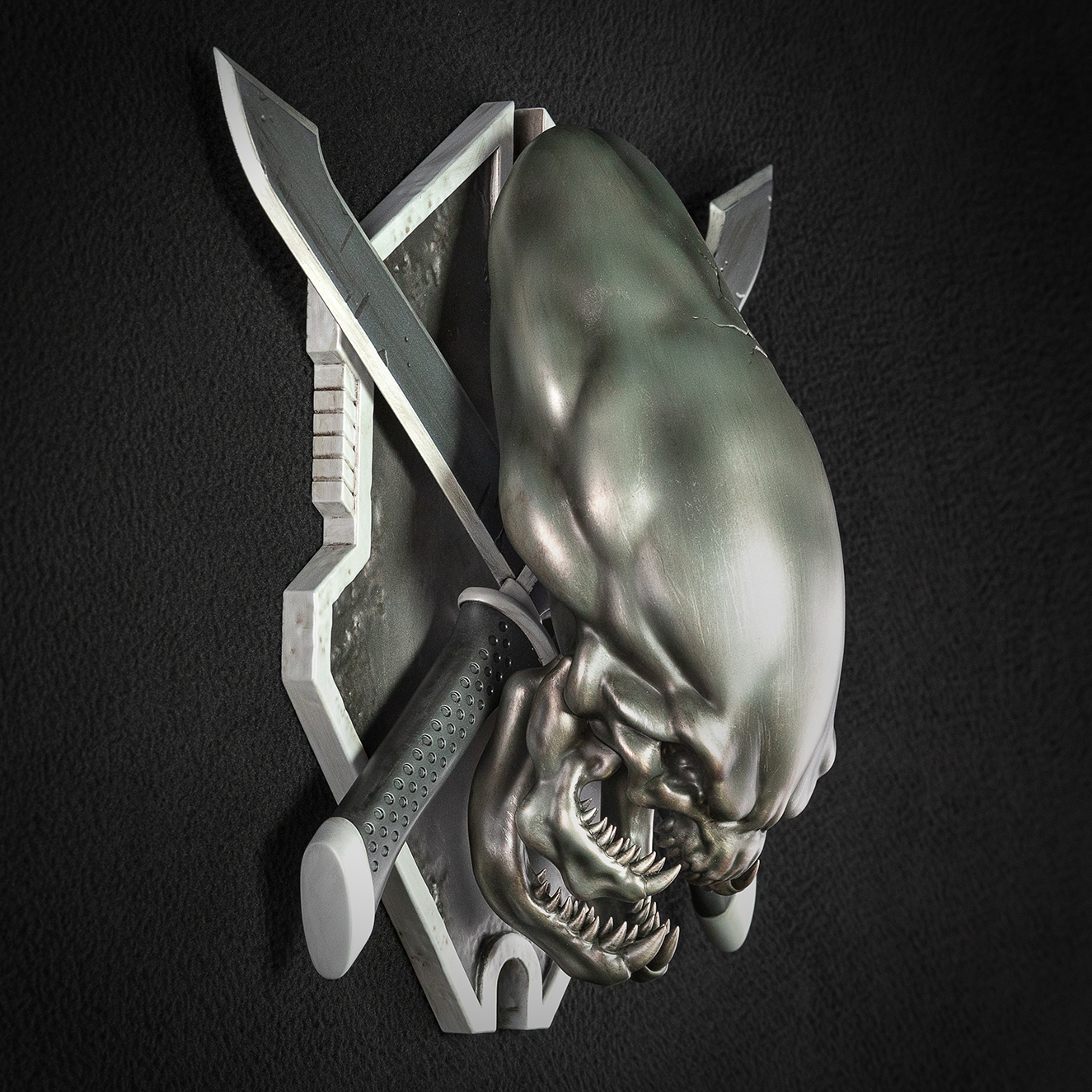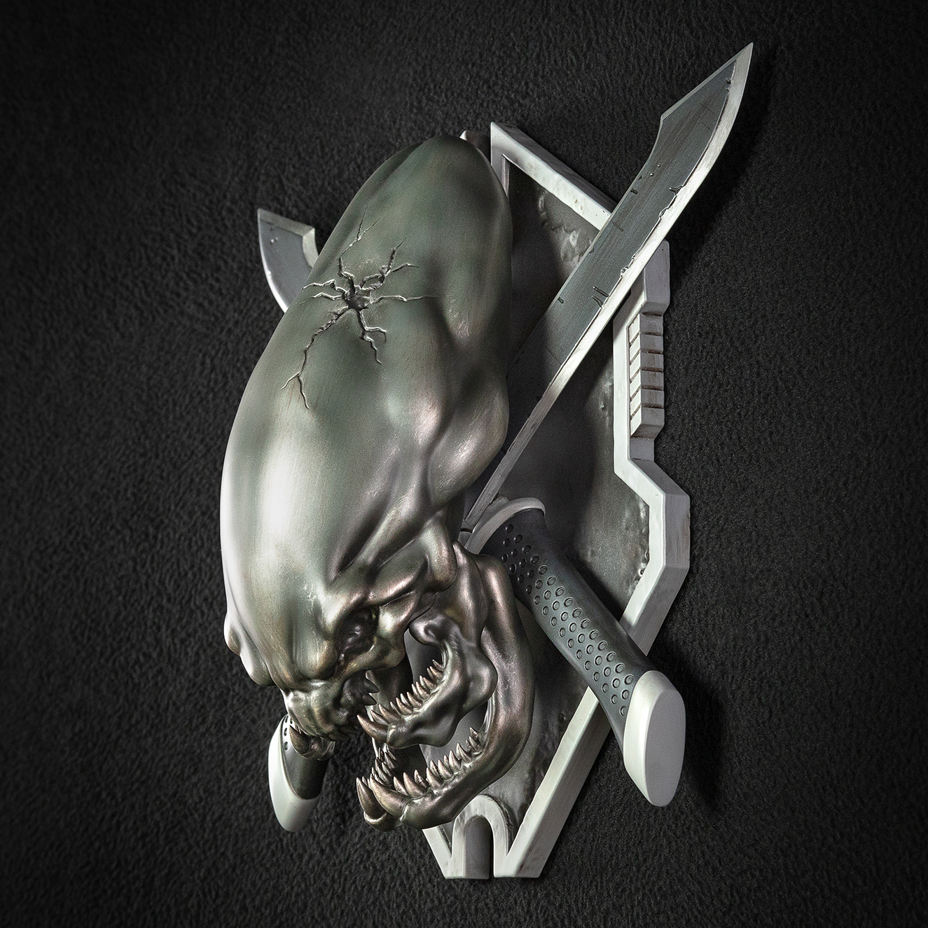 Depicting a bullet-scarred Elite skull on crossed combat knives, this wall mount measures